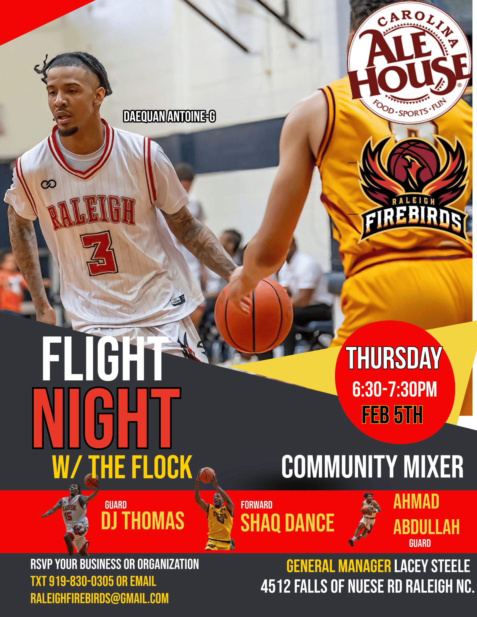 The Raleigh Firebirds, in partnership with YCG, invite Firebirds fans and Wake County residents to join us for Thursday Night Flight Night on Thursday, February 5. The community meet-up will take place at Carolina Ale House (Falls of Neuse Rd) in Raleigh from 6:30 PM to 7:30 PM.
